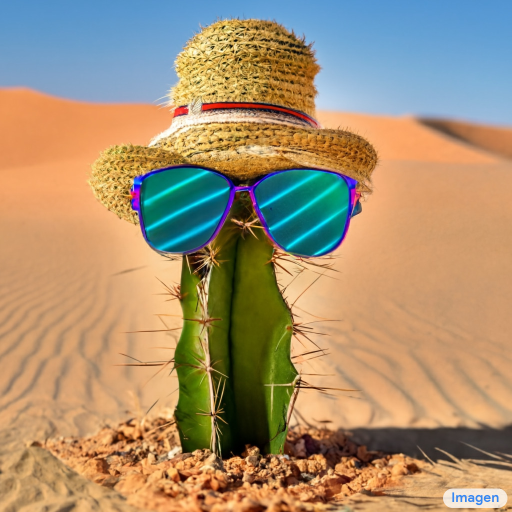 A small cactus wearing a straw hat and neon sunglasses in the Sahara desert.
